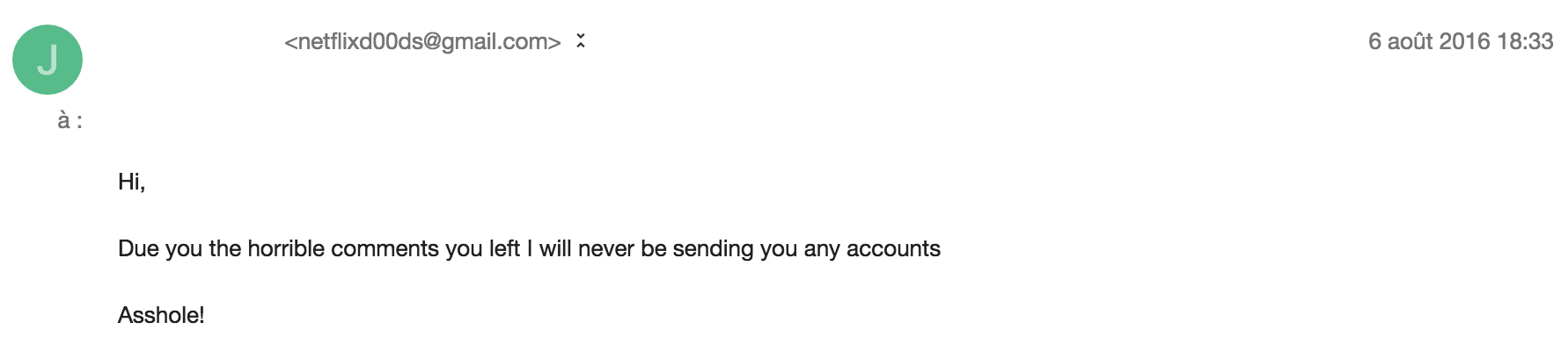 http://i.imgur.com/prlyHfi.png Это, как он относится к своим клиентам ... Для тех, кто рассматривает возможность покупки от этого парня, подумайте дважды. Ну, я не знаю, если он является мошенником или нет, но вы можете сохранять спокойствие и просить замены или потерять спокойствие и начать этот ювенильный megabig-шрифт крестового с настойчивостью, как если бы не было завтра. Но вы не можете сделать последний и ожидать, что бывший все еще будет работать, если бы я был продавцом, и вы вели себя таким образом, я бы отрезать вас, как хорошо. Если вы покупаете что-то в магазине, он не работает, вы возвращаетесь претендовать на замену, они, возможно, не реагируют так, как вы ожидали, и вы начинаете действовать, и обижать людей, то они будут просто вызвать безопасности (и возможно, даже полиция) и вышвырнуть тебя там (и, возможно, возбудить уголовное дело против вас словесного нападения, угрожая, что угодно), независимо от того, что вы изначально были в вашем праве. Затем, после того, как вы разобраться в вашей вновь приобретенные криминальную славу, вы можете подать подобающее гражданский иск против магазина, но потом, если вы говорите, один одного плохого слова перед судьей он будет у вас арестовали за неуважение к суду, отклонить претензию и штраф вы в таком количестве, что вы будете сожалеть не держать свой рот на замке. Все это время вашего первоначальный иск о нерабочей продукции, купленной в истории был оправдан. Серьезно, я спросил красиво, но затем он заблокировал меня на Skype и начал игнорировать мои письма ... Я не думаю, что я единственный, кому это произошло, так что я хочу, чтобы предупредить людей об этом. Он обещает людям счета законны и что Вы можете изменить пароль, но это полная ложь. Счет взломаны, и именно поэтому они не длятся более чем на несколько дней, потому что он продает те к большому количеству людей, и тогда эти люди начинают добавлять, удалять существующие пользователь, а затем фактический владелец счета заметить и изменить пароль. Это случилось со мной каждый раз, когда за счет Netflix и Hulu он продал мне ... |