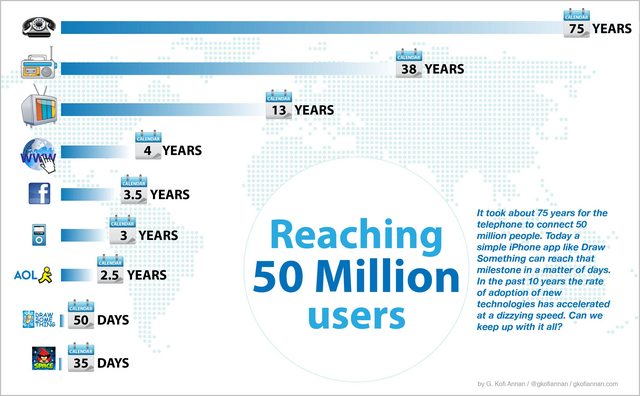 Простой ответ: нет. Их 4 года до 50М для Интернета является сомнительное утверждение. Первые два узла ARPANET, которые в конечном итоге стали бы Интернет был в 1969. Я уверен, что они не означает, что было 50 миллионов пользователей в 1973 г. Скорее всего, они используют некоторые искусственные "запуск рекламного ролика" Интернет и подсчет 4 года оттуда. Они, вероятно, путают WWW с Интернетом снова. Случается все время. |