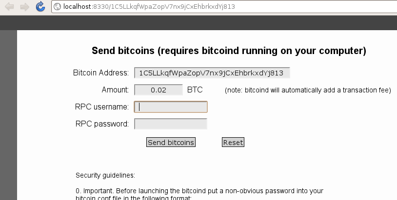 После правильной конфигурации (бег "bitcoin.exe -server" а также "bitcoin_httpd.exe") "Отправить BTC" Кнопка приводит к веб-сайту LOCALHOST: