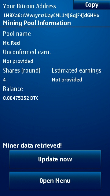 BitWatch позволяет получить статистику майнинга, такие как подтвержденные награды, количество акций, находящиеся на текущем раунде, непроверенной награду и (надеюсь, в будущем) больше! Она также позволяет сохранить Bitcoin-адрес, который вы можете скопировать в буфер обмена с помощью одного крана в случае, если вам нужно будет его где-нибудь.