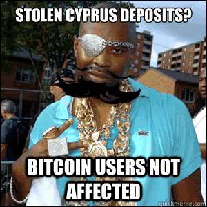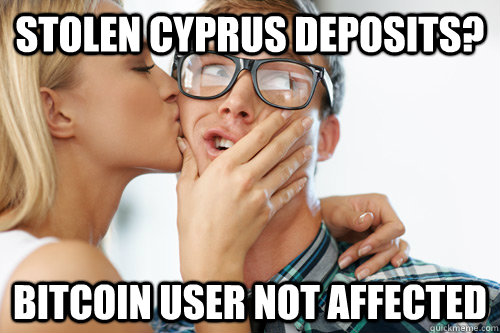 Это только один редкий отличная возможность, чтобы вызвать интерес к Bitcoin. Просто распространение мема «Пользователь Bitcoin не влияет». Люди говорят об этом везде и понимают, что то, что происходит на Кипре могут произойти в их собственной стране везде и в любое время, и когда это произойдет, то это будет сделано без каких-либо уведомлений и без каких-либо шансов заранее вывести свои средства.
