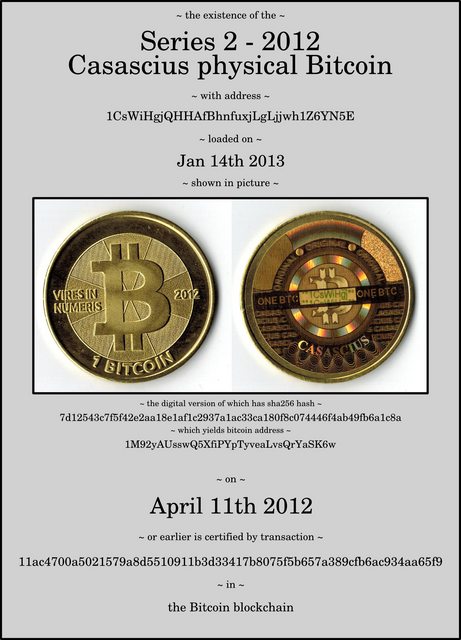 Это будет работать только для продуктов, которые я произвожу с сегодняшнего дня вперед, но вот это идея, которую вы можете сделать прямо сейчас. Подделка еще не произошло. Перейти бросить свой текущий тайник Casascius монет на сканер, сканирование фото из них, возьмите 160-битный хэш файла, а затем работать этот хэш в блок цепи каким-то образом. Преобразование хэш адреса Bitcoin и отправить Satoshi к нему (мой Bitcoin адрес Утилита может сделать это, например). Ваша фотография с поддерживающим его хэшем в блоке цепи будет публично проверяемым доказательством того, что монета в вашей фотографии существовала сегодня.