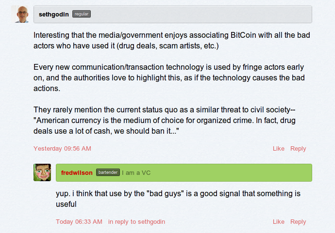 Фред Уилсон очень хорошо известный Нью-йоркский венчурный капиталист. В этом блоге он говорит о Bitcoin и недавней статье Wired (Взлет и падение Bitcoin). Это очень интересно посмотреть этот вид интереса.