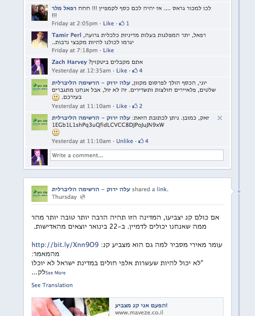 Это очень новая партия, они только действительно начали работать несколько месяцев назад. Предыстория в том, что зарождающееся либертарианское движение в Израиле только появилось около двух лет назад, и была быстро растет с тех пор. Несколько крупных активисты взяли на старую партию марихуаны ("Але Ярок," или "Зеленый лист") И превратил его в чистую либертарную партию. Они будут баллотироваться на предстоящих выборах в течение нескольких недель. Трудно сказать, если они попадают в парламент, но они были довольно успешны в распространении их сообщения. Например, их страница Facebook имеет более 40 тысяч подобных и вырос почти 30 000 подобных всего за месяц. http://www.facebook.com/AleYarokLiberal?fref=ts Я считаю, что они будут иметь достаточное количество избирателей, чтобы попасть в Кнессет (парламент?) |