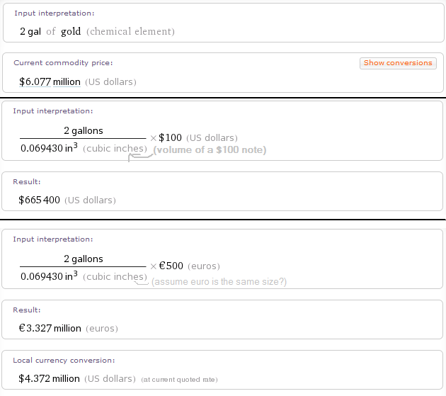 цитировать ответ |  Re: Кто нужен Bitcoin отмывать деньги, когда у вас есть ...  2 галлона ~ = 7.5lt.  2 галлона золота = 146Kg = 5,691 млн швейцарских франков = 5691 * 1000 CHF = указанный чемодан, намного легче |