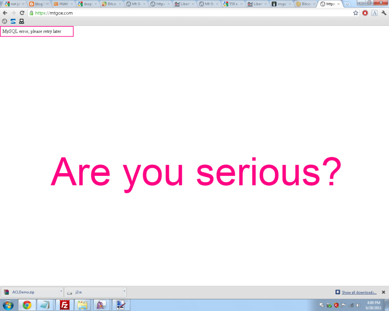 получение Ахольд MTGox, вероятно, будет хорошим началом Лол. Я открыл тикет 3 раза, чтобы получить биткоен я осажденный сразу после аварии. НИЧЕГО НЕ СДЕЛАНО. Они сидят на своих монетах, а не отвечать на ГОВНО. Я дам им еще один день, прежде чем я перейду свой бизнес в другом месте. У них было достаточно времени, чтобы понять это. У них было достаточно времени, чтобы пересмотреть свой билет поддержки. ЕЩЕ НИЧЕГО. Я устал от их дерьма. |