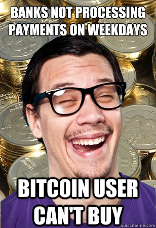 Ваш мем имеет нулевой смысл, так как если кто-то не покупали биткойна пока они не пользователь Bitcoin, и если они есть, банки были закрыты в выходные дни, не влияет на них. |