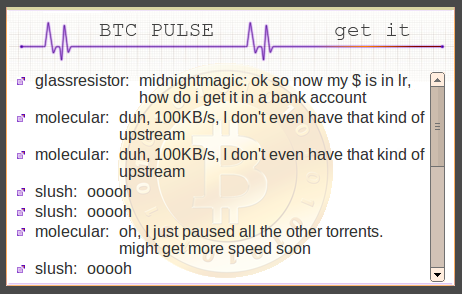 Во всяком случае, я хочу некоторые критические замечания. Плагин находится в открытой бете прямо сейчас, так что любой может попробовать. Посещение http://api.bitcoinbulletin.com/ чтобы проверить его или скопировать & вставить <тип сценария =»текст / JavaScript» SRC =»http://api.bitcoinbulletin.com/btcpulse»> скрипт> в HTML-файл.