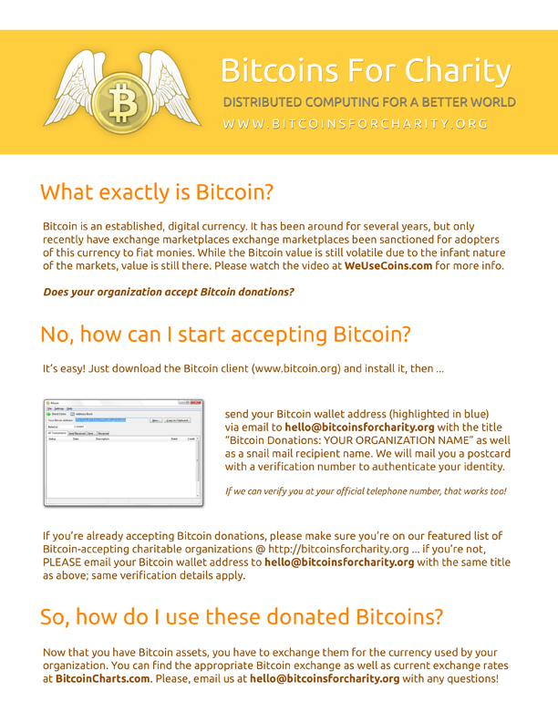 Как вы можете сказать, мы только три благотворительных перечисленным на нашем сайте. Это потому, что мы только особенность благотворительных организаций, которые принимают BTC пожертвования от своего имени. Мы не хотим, чтобы быть облегчить обменивающиеся средства, мы создали этот сайт для одной цели: чтобы сделать мир лучше. Мы не принимаем пожертвования от имени какой-либо партии, в нижней строке. Но мы начали принимать меры, чтобы информировать о благотворительных Bitcoin, и что первый шаг получить слово. Вы можете помочь нам, отправив этот флаер евангелизации Bitcoin и его использование. Не стесняйтесь Photoshop ваших TradeHill направления URL где-то на PDF, если вы хотите.