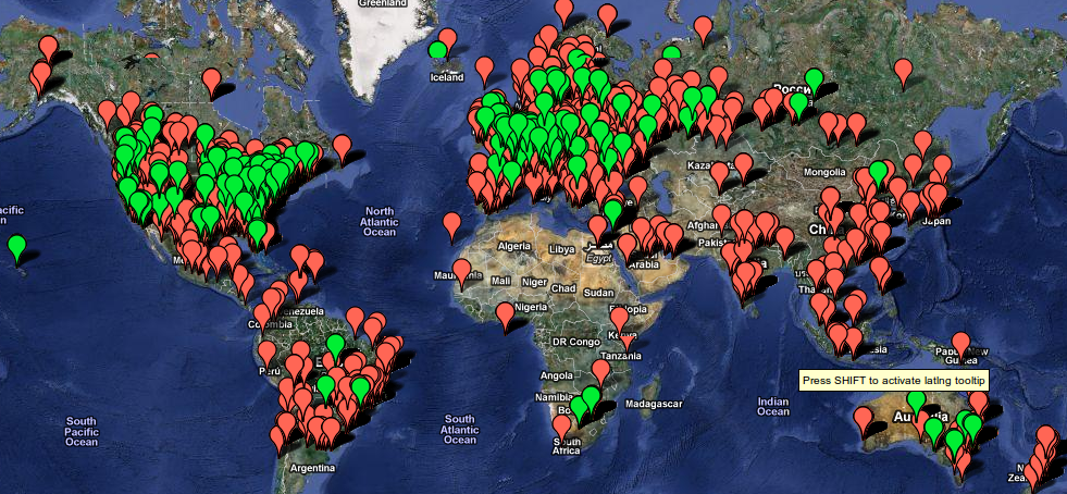 Интерактивная карта Google ссылка: http://maps.google.com/maps?q=http://c1958612.r12.cf0.rackcdn.com/bitcoin.kml