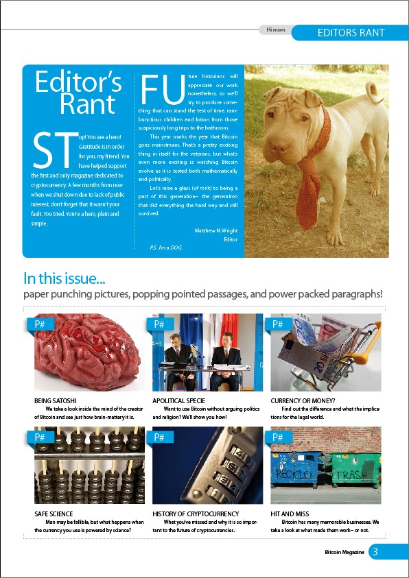 Этот журнал будет меняться так, как люди смотрят на Bitcoin в средствах массовой информации. Он будет представлять нас с внешним миром. Когда люди идут просматривают раздел журнала, они будут захватывать этот журнал и открыть его, чтобы увидеть, что Bitcoin это все о.