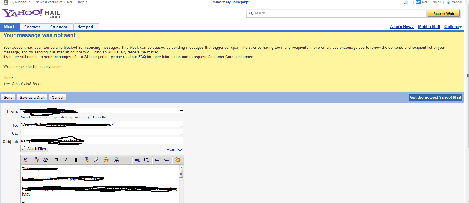 Просто пытался посылать себе электронную почту с Yahoo с названием будучи Bitcoin и сообщение, содержащее слово Bitcoin со ссылкой bitcointalk.org.